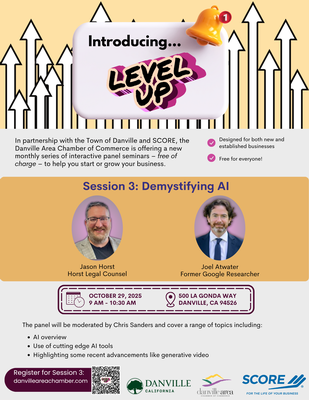 In partnership with the Town of Danville and SCORE, the Danville Area Chamber of Commerce is launching a new monthly series of interactive panel seminars – free of charge – to help you start or grow your business. Our third session will focus on how Artificial Intelligence (AI) is growing in popularity and usage, and will cover tips on how to make AI work for you. The session's goal is to make AI less intimidating and more practical for small businesses. You'll leave with a clearer understanding of risks, opportunities, and where things are headed.